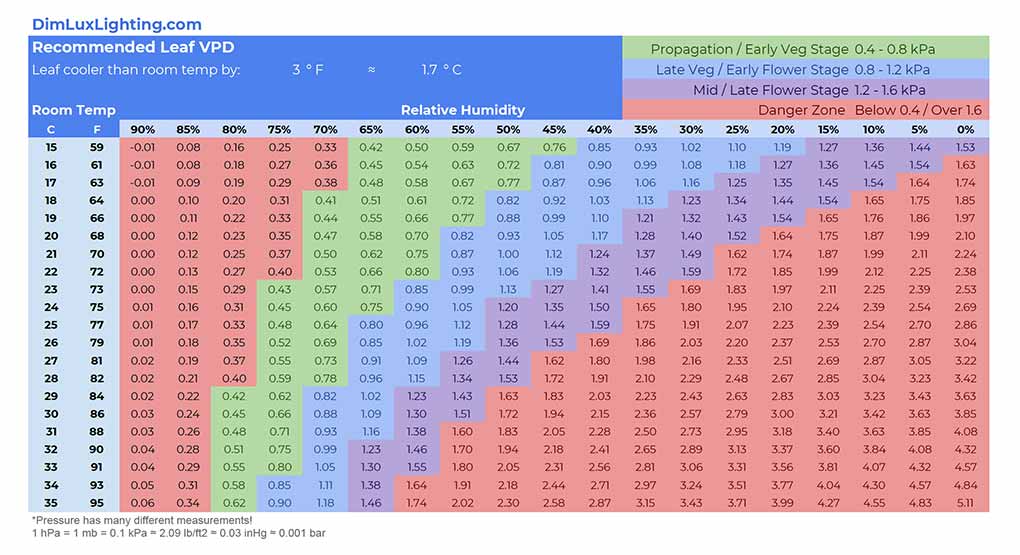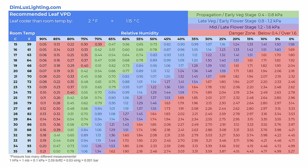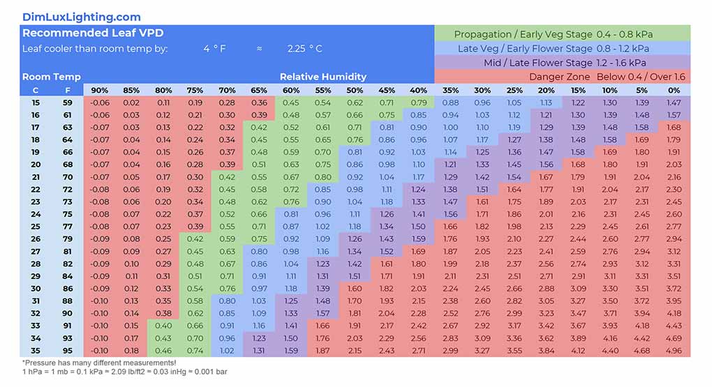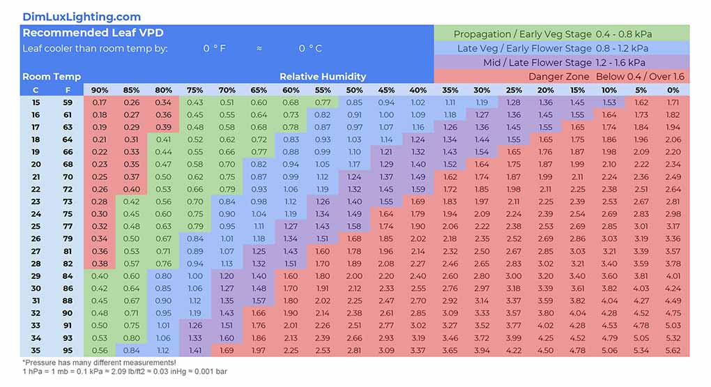According to the temperature difference between plant temperature and room temperature, the water Vapor Pressure Deficit table that needs to be referred to is different. The following is a table of water Vapor Pressure Deficits that can be used for temperature differences of 0 degrees Celsius, 1℉, 2℉, 3℉, 4℉, and 5℉. These will help you maintain optimal humidity and temperature levels in the growth chamber at every stage of the plant.